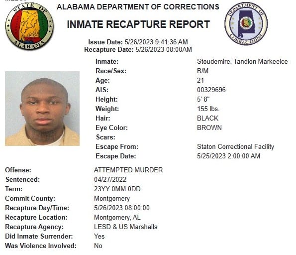 The Alabama Department of Corrections has recaptured Tandion Markeeice Stoudemire, 21, who escaped from the Staton Correctional Facility in Elmore County Thursday.