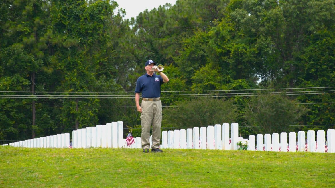 The commemoration featured a wreath-laying ceremony, accompanied by folding of an American Flag, a moment of silence followed by a rifle volley, the playing of Taps, and an Honor Guard salute. The cemetery also had an American flag at the grave of each fallen Alabama veteran, which were placed by local members of the Cub Scouts and Boy Scouts of America and volunteers from the community.