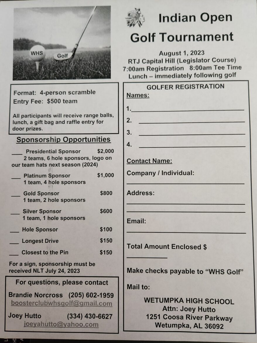 Wetumpka High School’s Booster Club will hold the Indian Open Golf Tournament Aug. 1 as a fundraiser. The format is a four-person scramble with an entry fee of $500 per team. It will take place at Robert Trent Jones Capitol Hill on the Legislator Course in Prattville.