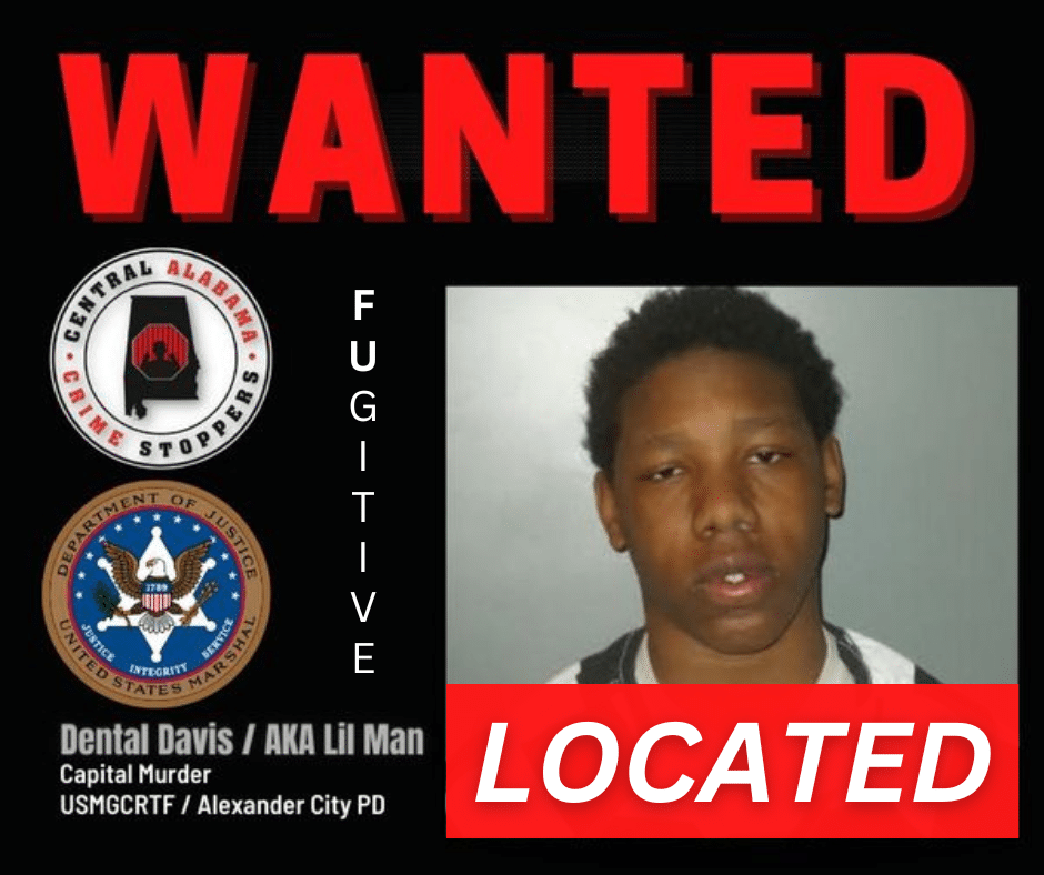 The United States Marshals Service Gulf Coast Regional Task Force notified Central Alabama CrimeStoppers and advised they have located fugitive, Dental Davis.