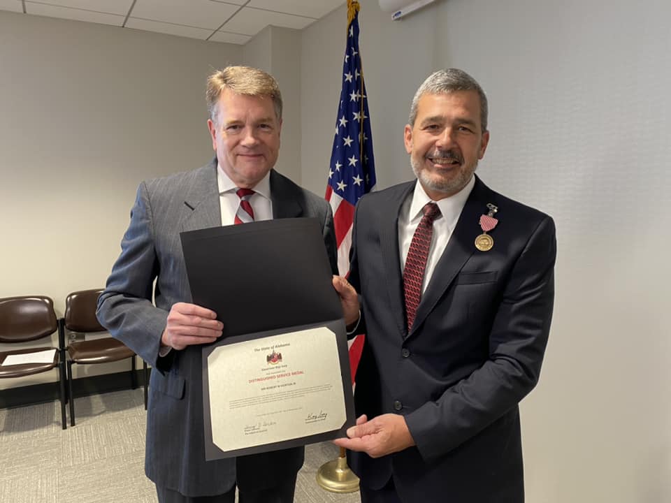Top Photo: Bob Horton: ADVA Commissioner Kent Davis (left) presents Bob Horton with the Alabama Distinguished Service Medal.