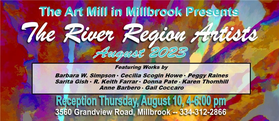 The Art Mill in Millbrook Presents The River Region Artists August 2023 Featuring Works by: Barbara W. Simpson, Cecilia Scogin Howe, Peggy Raines, Sarita Gish, R. Keith Farrar, Donna Pate, Karen Thornhill, Anne Barbero, and Gail Coccaro. Reception Thursday, August 10, 4-6:00 pm 3560 Grandview Road, Millbrook
