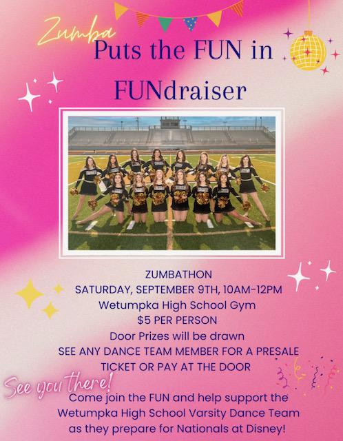 The Wetumpka High School Varsity Dance team is hosting a Zumbathon at the WHS gym on Saturday, September 9th from 10am-12pm. Tickets are $5 (we have presale now or pay at the door on day of event.) We are also going to be drawing for lots of fabulous door prizes.