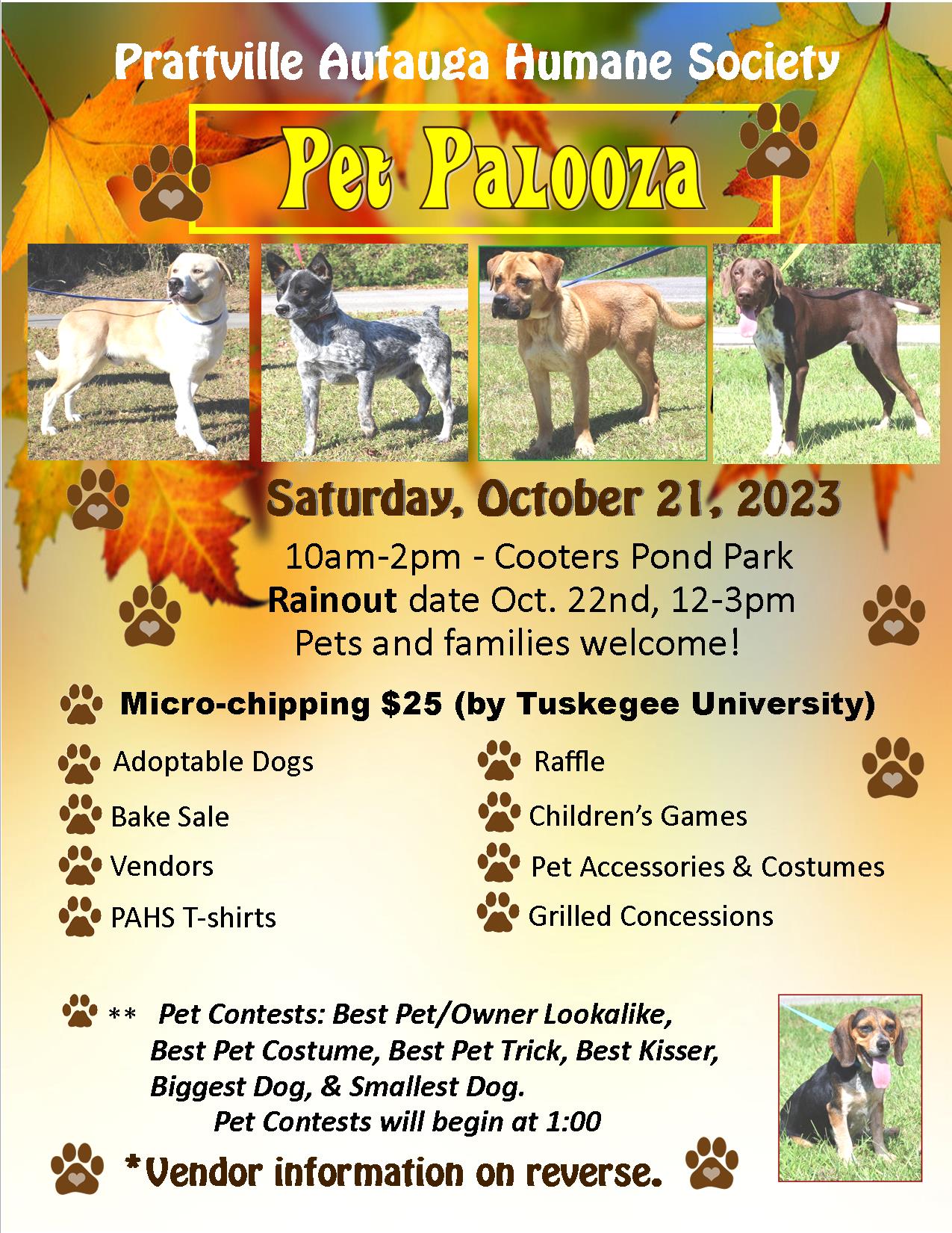PAHS is open 11-4 Monday thru Saturday. Please contact Prattville/Autauga Humane Society for most current information: 1009 Reuben Road, Prattville, AL – Phone: 334-358-2882 Email Address: [email protected]