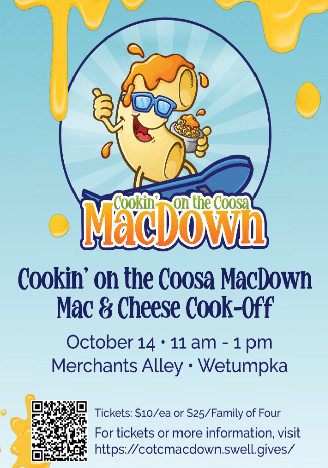 Presented by Barry and Laura Harmon and the J.K. Lowder Family Foundation, Cookin’ on the Coosa MacDown is a culinary competition bringing together both professional and amateur cooks to showcase their creativity and skills with Mac & Cheese. Attendees will have the opportunity to sample a variety of mac and cheese dishes, each vying for the coveted title of MacDown Champion.