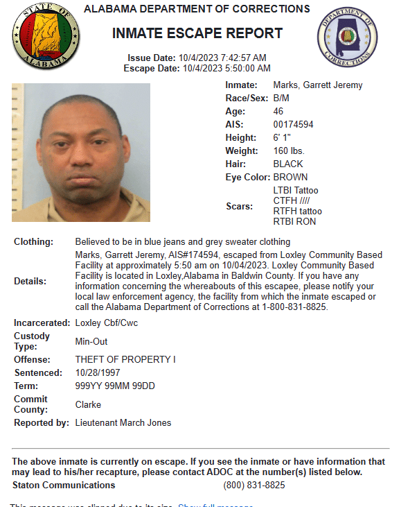 Garrett Jeremy Marks, 46, has escaped from a Loxley Community Based facility in Baldwin County.
