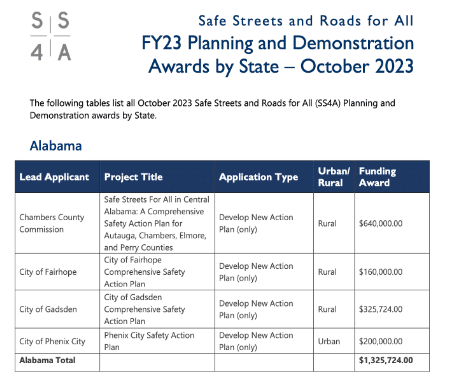 The U.S. Department of Transportation (USDOT) recently announced its Safe Streets and Roads For All (SS4A) grant awardees. Elmore County along with Autauga, Chambers, and Perry Counties were among those selected for funding. The fiscal year 2023 awardee list included 235 grants totaling $82 million to regional, local, and Tribal communities for planning and demonstration projects to improve safety and help prevent deaths and serious injuries on the nation’s roadways.