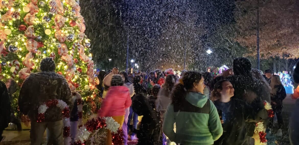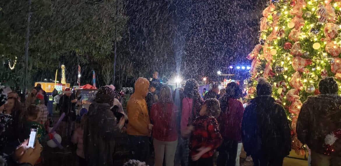 With a creatively decorated backdrop at Village Green Tuesday, the large crowd cheered as the official city Christmas tree was lit, and snow began to fall.