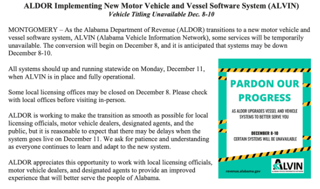 ALDOR Vehicle Titling Unavailable Dec. 8-10