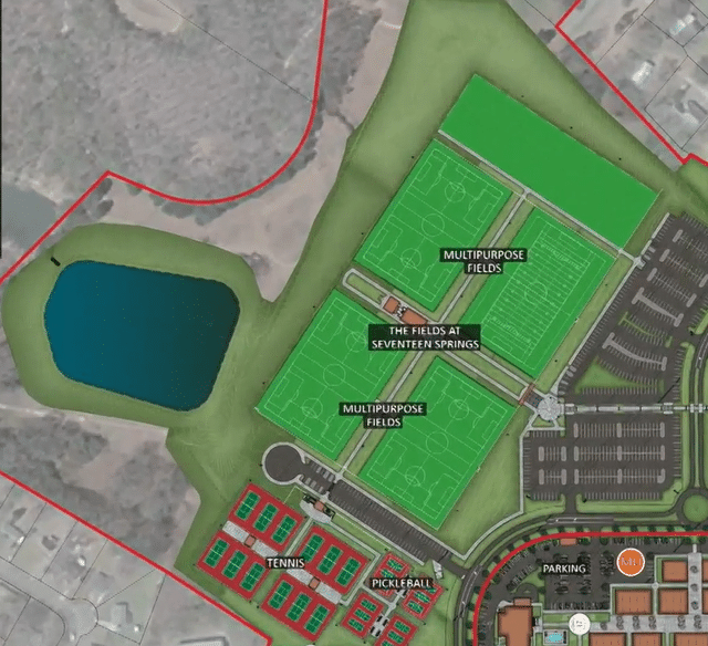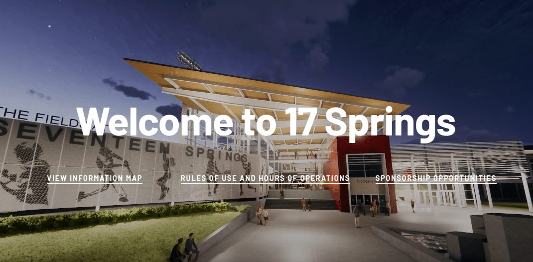The Fields at 17 Springs Phase 1 opened August 2023 and includes four multipurpose turf fields, one grass field, 12 tennis courts, and 12 pickleball courts. Phase II is slated to open in early 2025 and will include an 86,000 square foot multipurpose event center called the “Field House,” another multipurpose turf field located inside a stadium/event venue, a competition track with field events, and six diamond fields for softball and baseball use.