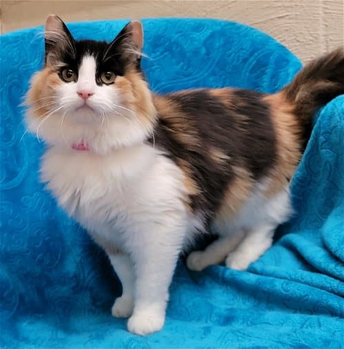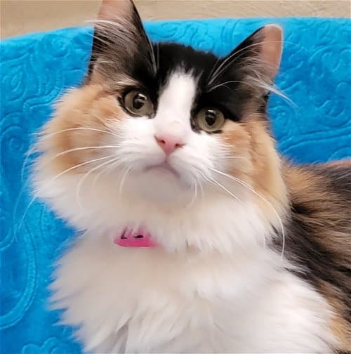 Seeking “diva” cat lovers! Raven is a 2 1/2-year-old stunningly gorgeous long-haired Calico female cat that is a diva in every way as life is on Raven’s terms. She is rather cat selective but in a home with maybe only one other cat where they can each have their own space should be fine. Raven lets you know when SHE wants attention and can be very sweet and then other times just wants to do her own thing. She is playful but tends to play with all claws and loves to run at you and grab around your leg so no children please.