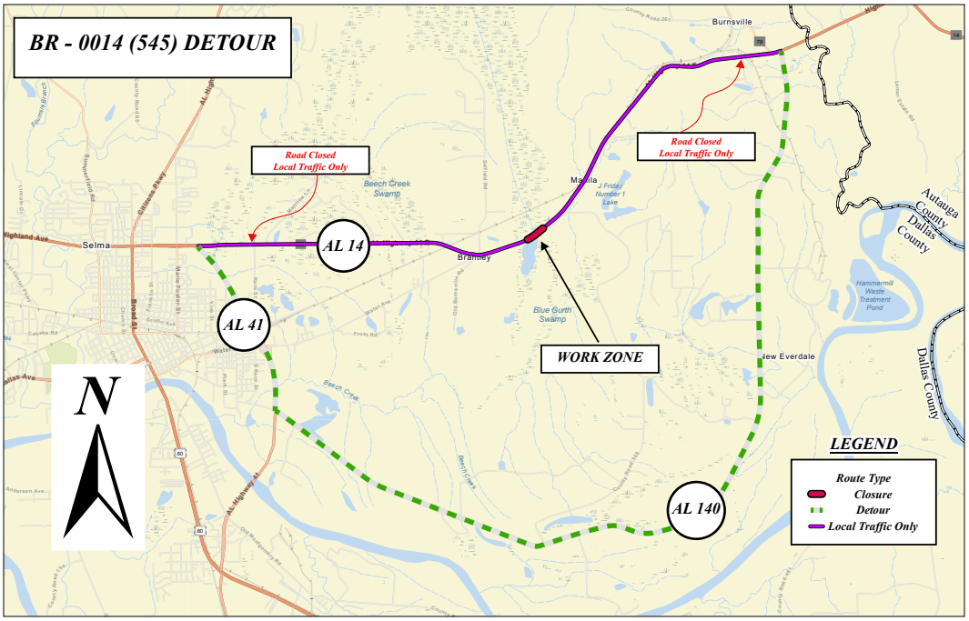 Dallas County – – An Alabama Department of Transportation project to replace the bridge over Blue Gurth Swamp on SR-14 in Dallas County will begin with sign and traffic control installation on Monday, February 12, weather permitting.