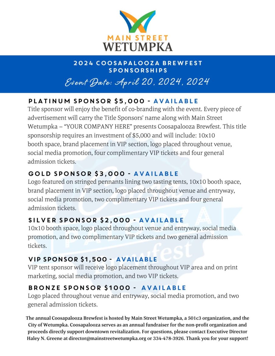 Is your business interested in sponsoring Coosapalooza Brewfest in April 2024? Coosapalooza serves as an annual fundraiser event for our non-profit organization and proceeds directly support downtown revitalization. All sponsorships are tax deductible!