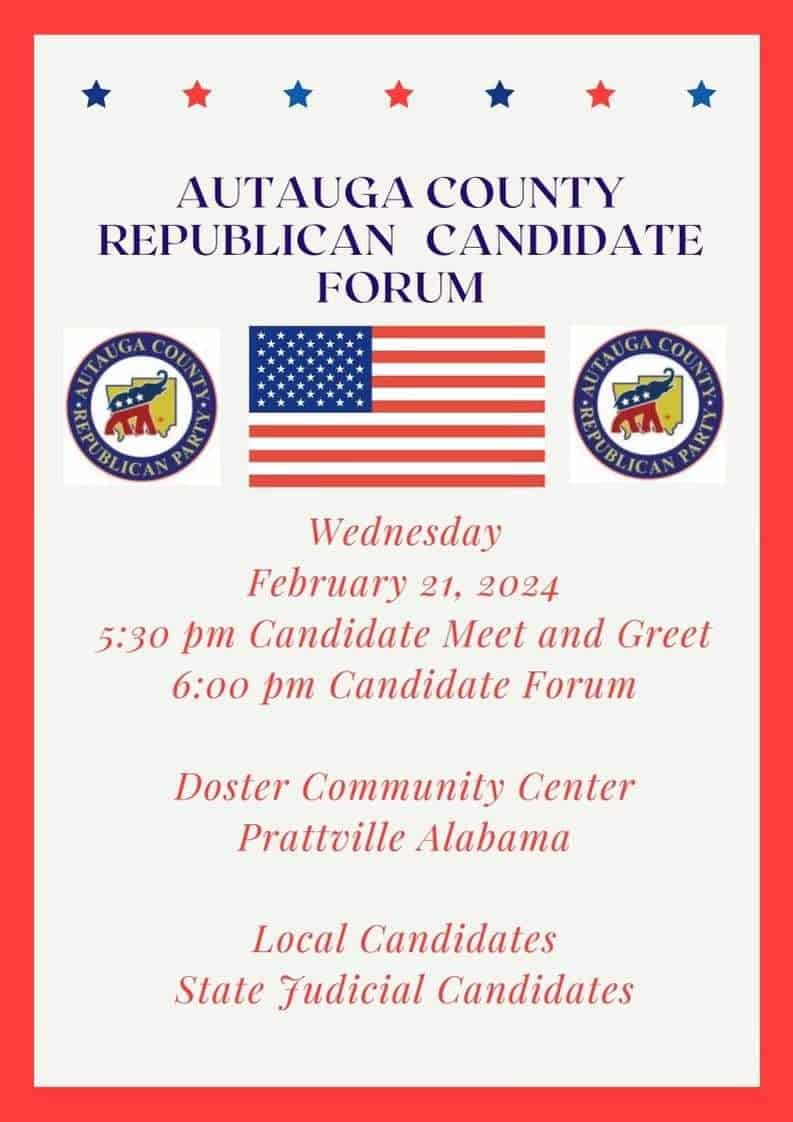 The Autauga County Republican Candidate Forum is tonight! The public is invited to come to the Doster Community Center tonight beginning at 5:30 p.m. for a Candidate Meet and Greet, followed by a Candidate Forum at 6 p.m.