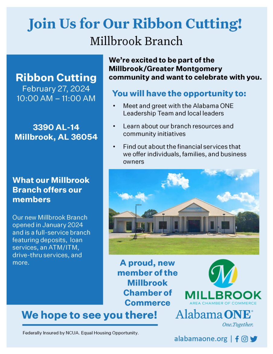 Alabama ONE is excited to announce the grand opening of a new branch in Millbrook, Alabama. The ribbon cutting ceremony will take place February 27, 2024 at 10 a.m. at 3390 AL-14, Millbrook, Alabama.