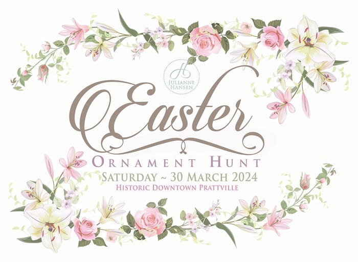The 5th Annual Easter Ornament Hunt created and sponsored by Julianne Hansen Fine Art & Pottery will be held in Historic Downtown Prattville this Saturday, March 30, 2024 from 7:00 a.m. – 3:00 p.m. or until all ornament cards* are found.