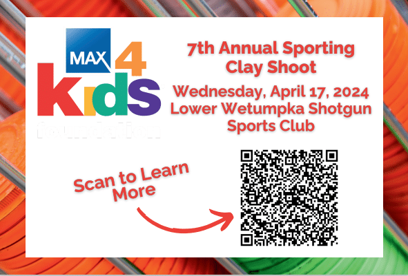 The MAX4Kids 7th Annual Clay Shoot will be held April 17th at the Lower Wetumpka Shotgun Sports Club. All proceeds from the Clay Shoot fundraiser go right back into the community through nine local nonprofit organizations and scholarship opportunities for local River Region graduating high school seniors.