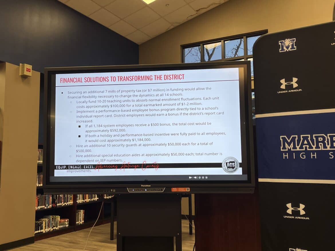 “We’re trying to be as transparent as we can legally be. We need to better equip our teachers and students with what they need. We literally operate on bare minimum because we’re completely relying upon what we get from the state. I do not anticipate building new facilities because, quite frankly, seven mills, I don’t know if that’s enough. But it will allow us to pay down our debt and renovate and get us to the point where we can build quicker than what we can on the current path,” Woodfin said.