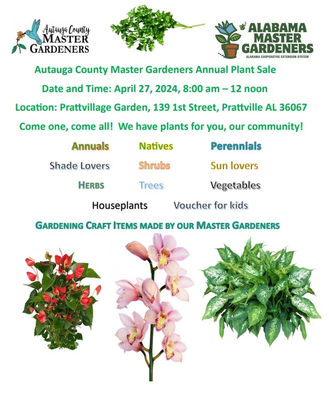 The annual Autauga Master Gardeners Plant Sale is April 27 at the Prattvillage Garden, 139 1st Street in Prattville from 8 a.m. to noon.