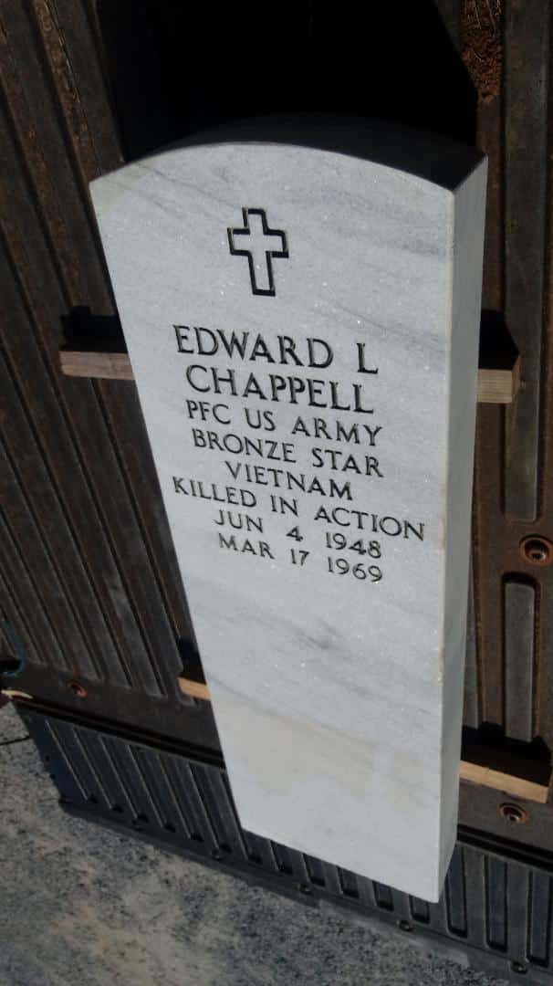Edward Chappell was raised in Autauga County where he attended the Autauga County Training School at Autaugaville. He graduated from this school in 1966, and then went to Chicago where he was subsequently drafted into service. He was a PFC in the U.S. Army serving in the 199 Light Infantry BDE (field artillery). He was killed in action on March 17, 1969, at Quang Ngai, Vietnam. His remains were returned to the United States and interred at Greater Mallards Chapel AME Church, Autauga County, on Sunday, March 30, 1969.