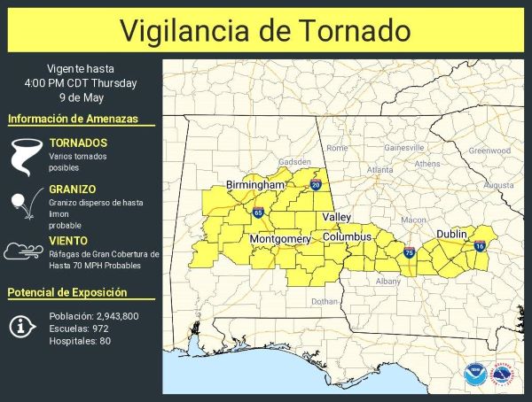 10am: The Anniston Airport recently measured a wind gust to 54 mph. Showers and thunderstorms continue to move eastward. As of 9:00 am, a tornado watch has been issued for parts of Alabama and Georgia until 4 PM CDT. Clusters of showers and thunderstorms will continue to affect central Alabama into this afternoon. While the main threat should be damaging winds, a couple tornadoes and large hail could occur as well.