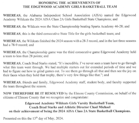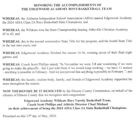 During the May 13, 2024 Commission Meeting, the Elmore County Commission approved resolutions honoring the accomplishments of Edgewood Academy Girls and Boys Basketball Teams as Alabama Independent School Association (AISA) 2024 Class 2A State Champions.