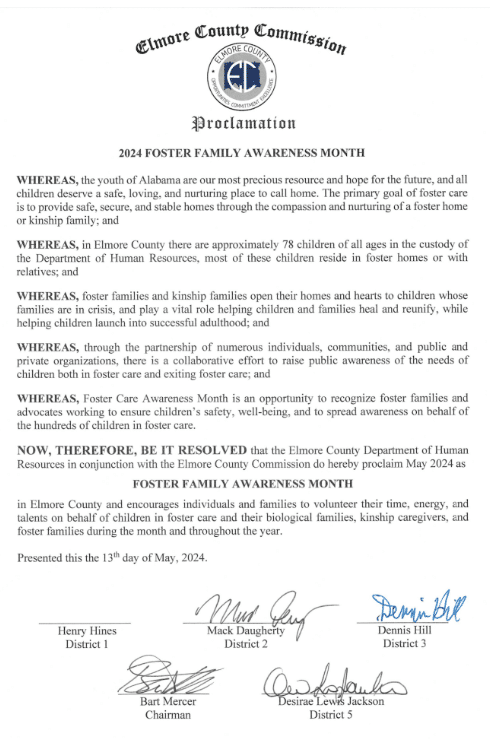 During the May 13, 2024 Commission Meeting, the Elmore County Commission approved a proclamation recognizing May as Foster Family Awareness Month.