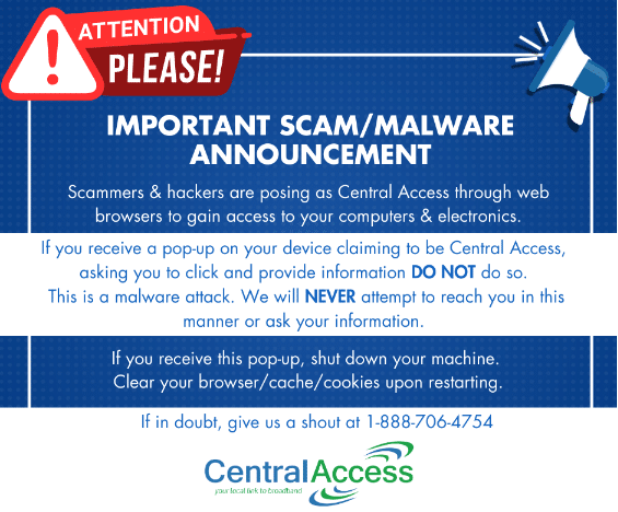 Central Access does not utilize pop-ups and will never solicit information or access to your electronics. If you receive a pop-up claiming to be Central Access or any internet provider, turn off your device. When you restart it, clear your browser history, cache and cookies.