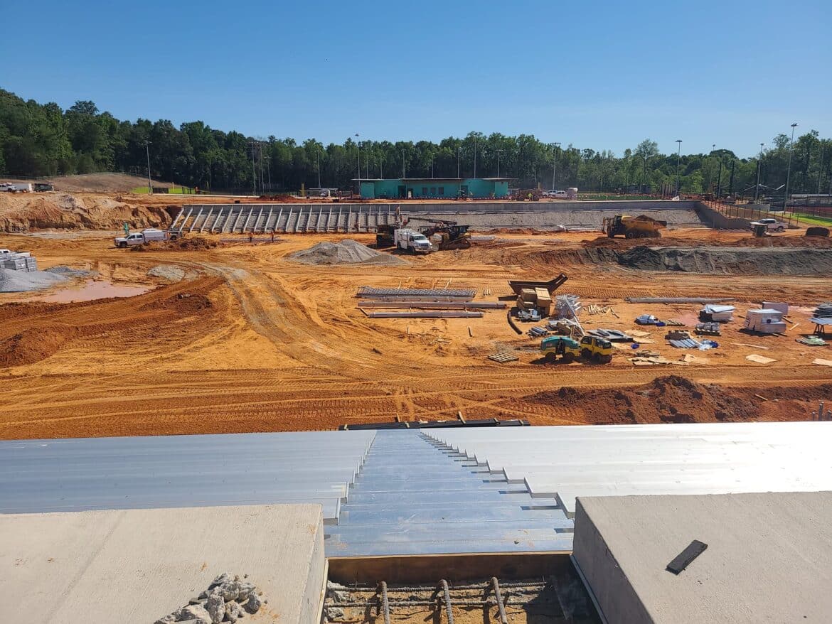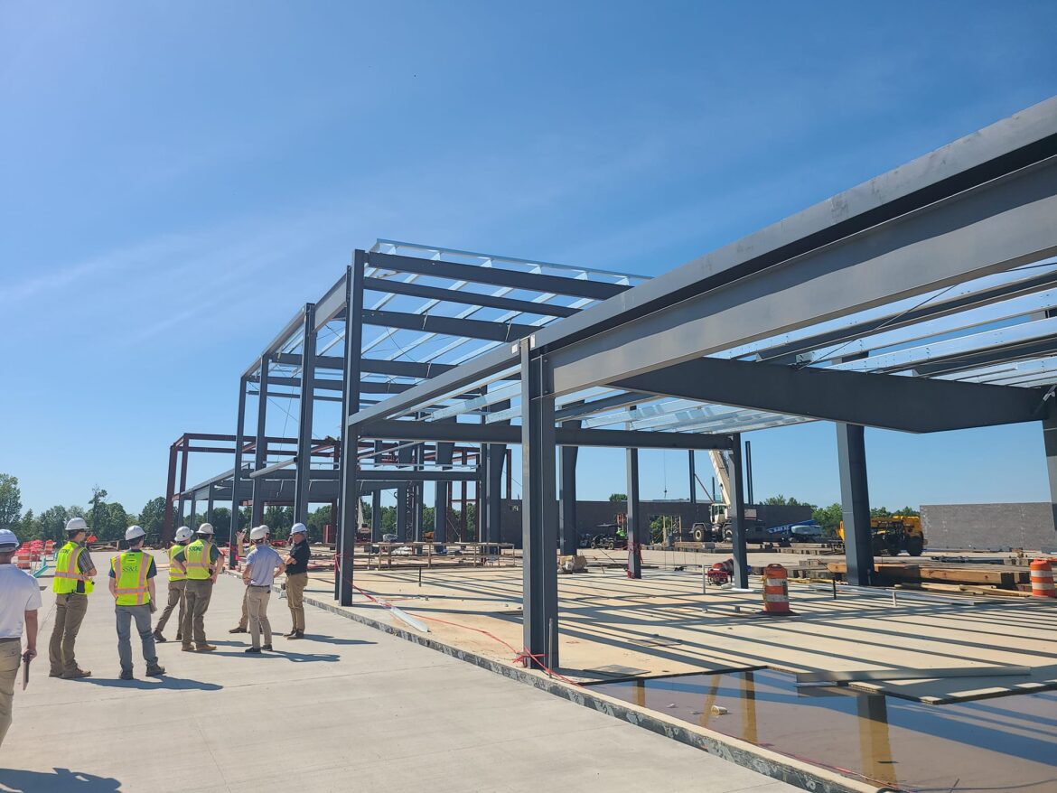 The beams of the field house are going vertical and now seen from Hwy. 14.