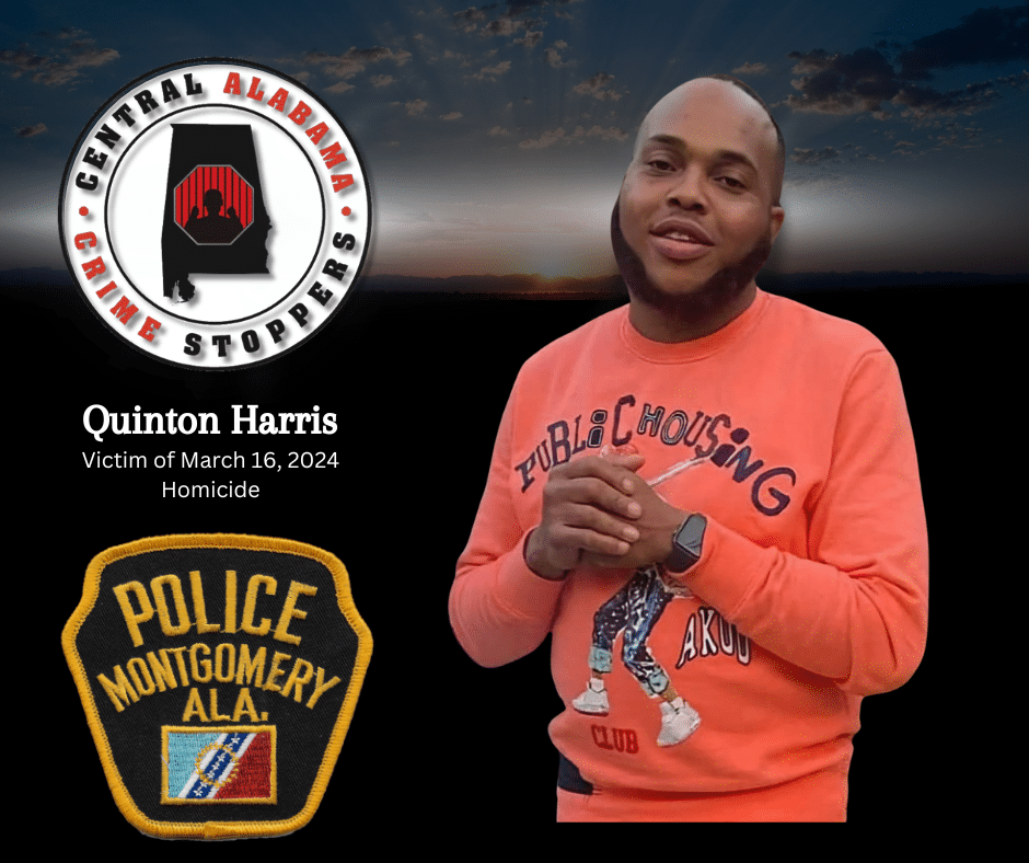 Investigators say on Saturday night, March 16, 2024, at about 11:45 p.m., police and medics responded to the 3700 block of Woodley Road, Montgomery, AL, in reference to a shooting. Police located an adult male who sustained a fatal gunshot wound. The victim was identified as Quinton Harris, 36, of Montgomery. Harris was pronounced deceased on the scene.