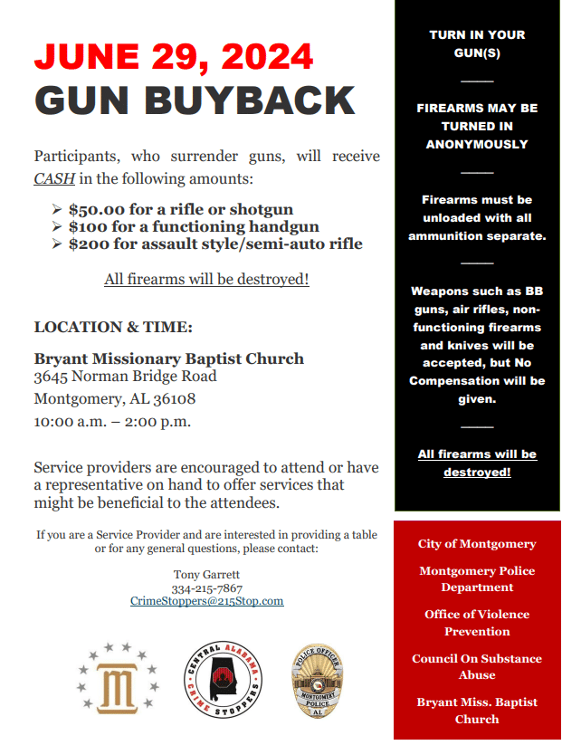 On Saturday, June 29, 2024, starting at 10:00 a.m. Central Alabama CrimeStoppers, in conjunction with the City of Montgomery, and the Montgomery Police Department, will be hosting an anonymous Gun Buyback event at the Bryant Missionary Baptist Church, located at 3645 Norman Bridge Road in Montgomery, AL. Citizens who surrender guns at this event will receive CASH in the amount of $50 for any rifle or shotgun, $100 for any functioning handgun, and $200 for an assault and/or semi-auto rifle.
