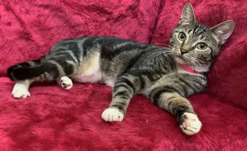 Luna is a two-year-old female grey tabby. She was found as a stray and very much wanted INSIDE the finder’s house so going to say she is an INSIDE kitty. She is a bit timid at first but warms up quickly and is very loving.