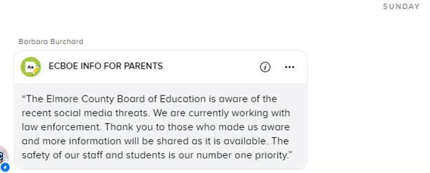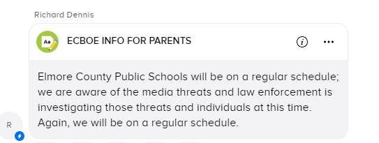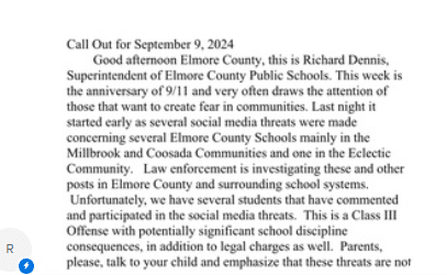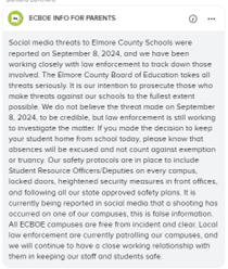 The Elmore County Leadership Team talked with law enforcement for an update Monday morning, September 9, 2024, and sent an updated statement to parents that morning at 9:38 AM. That message was sent using the following communication tools: