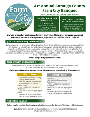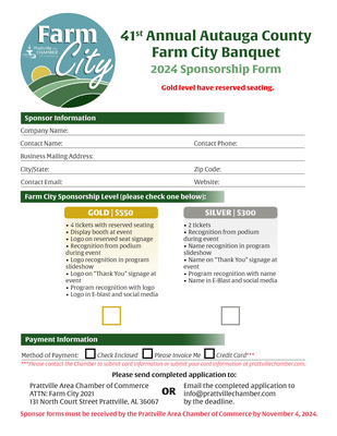 Every year since 1982, the Prattville Area Chamber of Commerce brings our community together to honor the rich agricultural heritage of the Prattville and Autauga County area with our Annual Farm City Banquet.