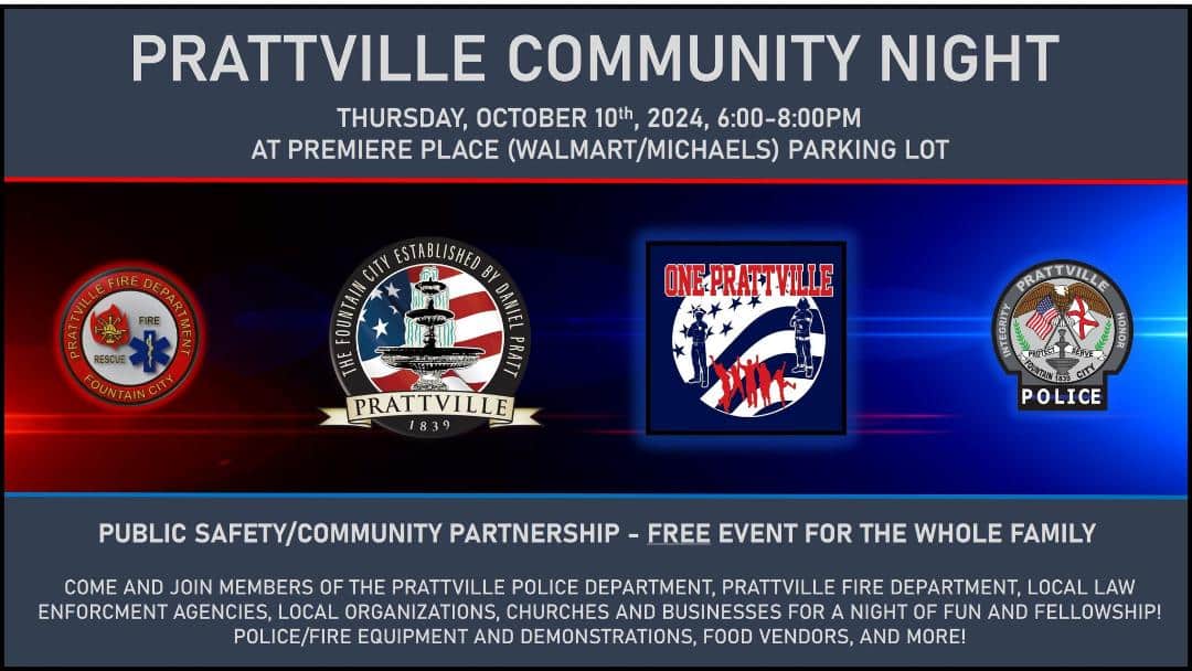 The Prattville Police Department, Prattville Fire Department, and the City of Prattville invite you to Prattville Community Night. Come out on October 10th from 6-8pm at the Premiere Place Parking Lot (Walmart Parking Lot near Michael’s) and meet the PPD, PFD and many other public safety agencies, churches, local organizations and community members as we spend an evening of fellowship together!