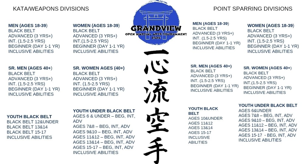 All skill levels are welcome, from beginner to blackbelt ranks, of all martial arts styles, with options for inclusive abilities divisions.