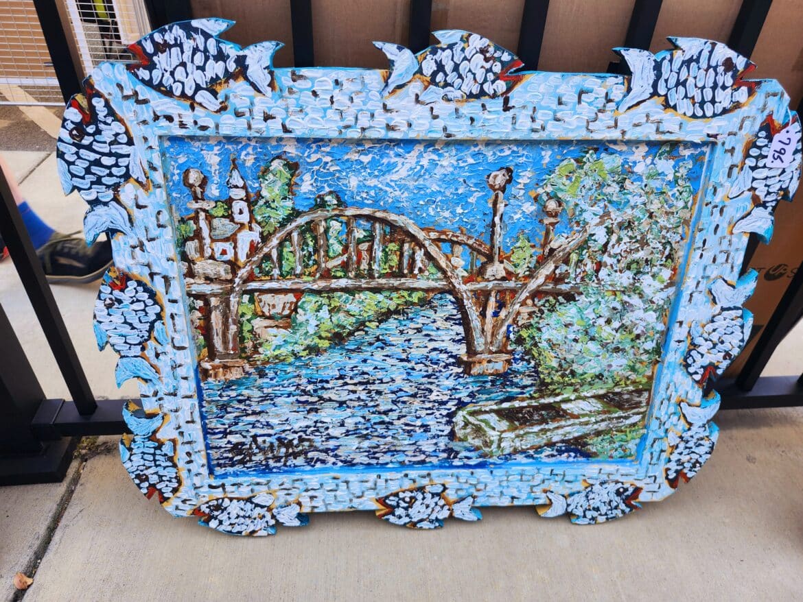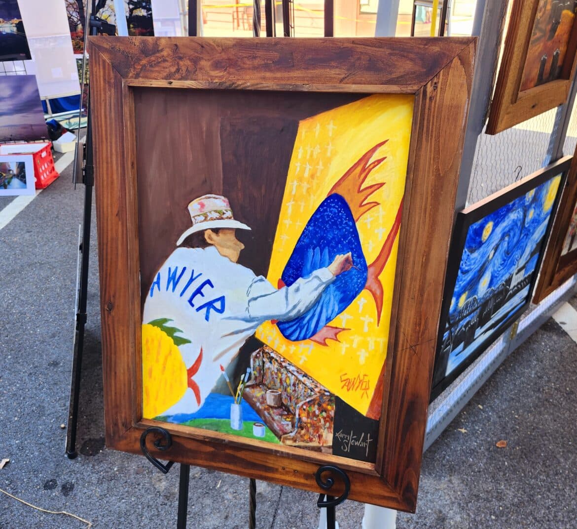 Sawyer’s most notable work is the Hollywood Fish. It almost always had a yellow background, with a fish wearing sunglasses and smiling. Many of his works also incorporated aspects of his life that he loved. For example, many of his paintings contained a cross or a church.