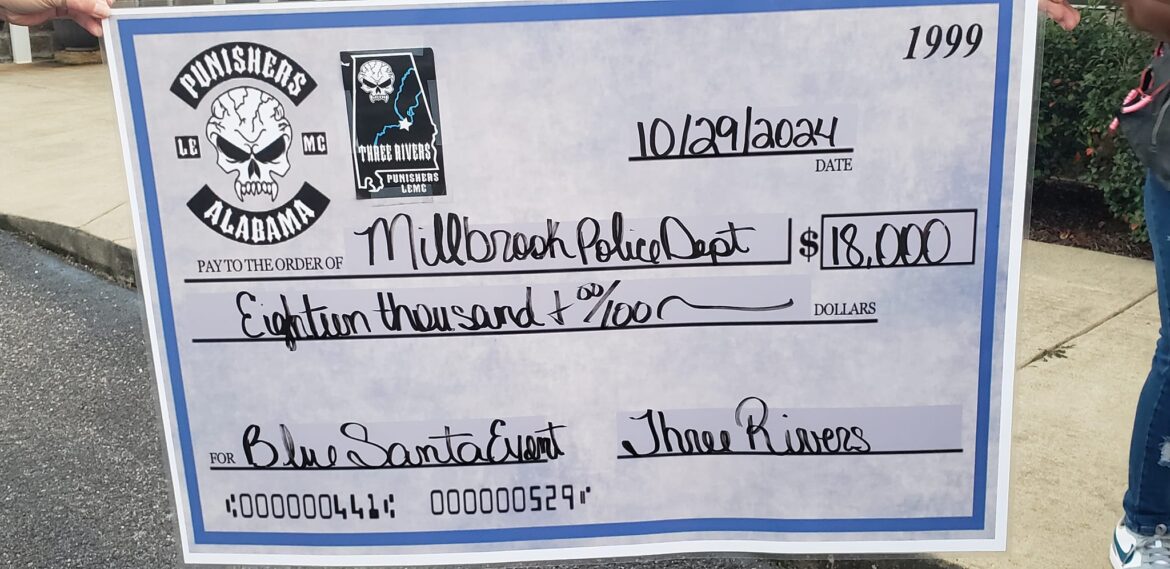 However, Tuesday night the funds to help pay for those presents got a tremendous boost in the form of $18,000 from the Punishers LEMC Three Rivers Chapter. The Punishers organization is an international motorcycle club made up of police officers, military, first responders or like-minded individuals. Members arrived at Millbrook Police Station to deliver the check in person to Chief P.K. Johnson.