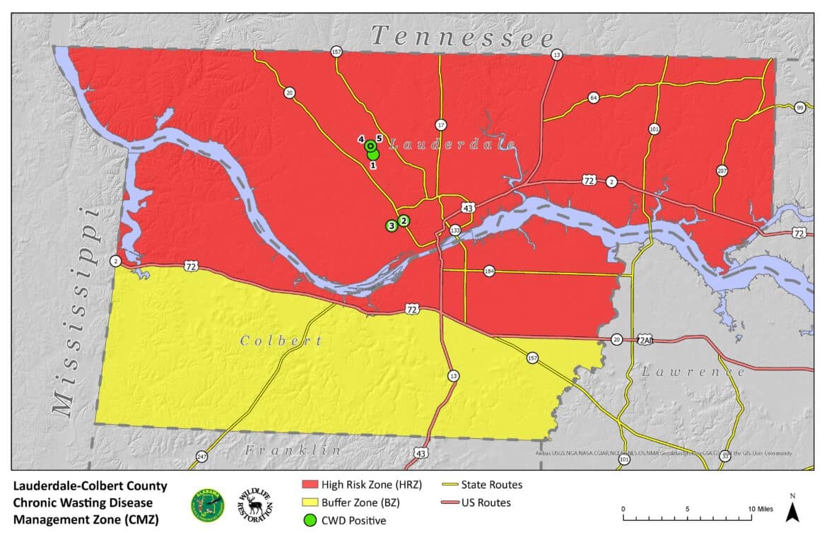 Under Alabama’s Chronic Wasting Disease (CWD) Management Zone Regulation (220-2-.167), all deer harvested in the High-Risk Zone and the Buffer Zone of the state’s CWD Management Zone (CMZ) must be submitted for CWD testing during specific weekends of the 2024-2025 white-tailed deer season.