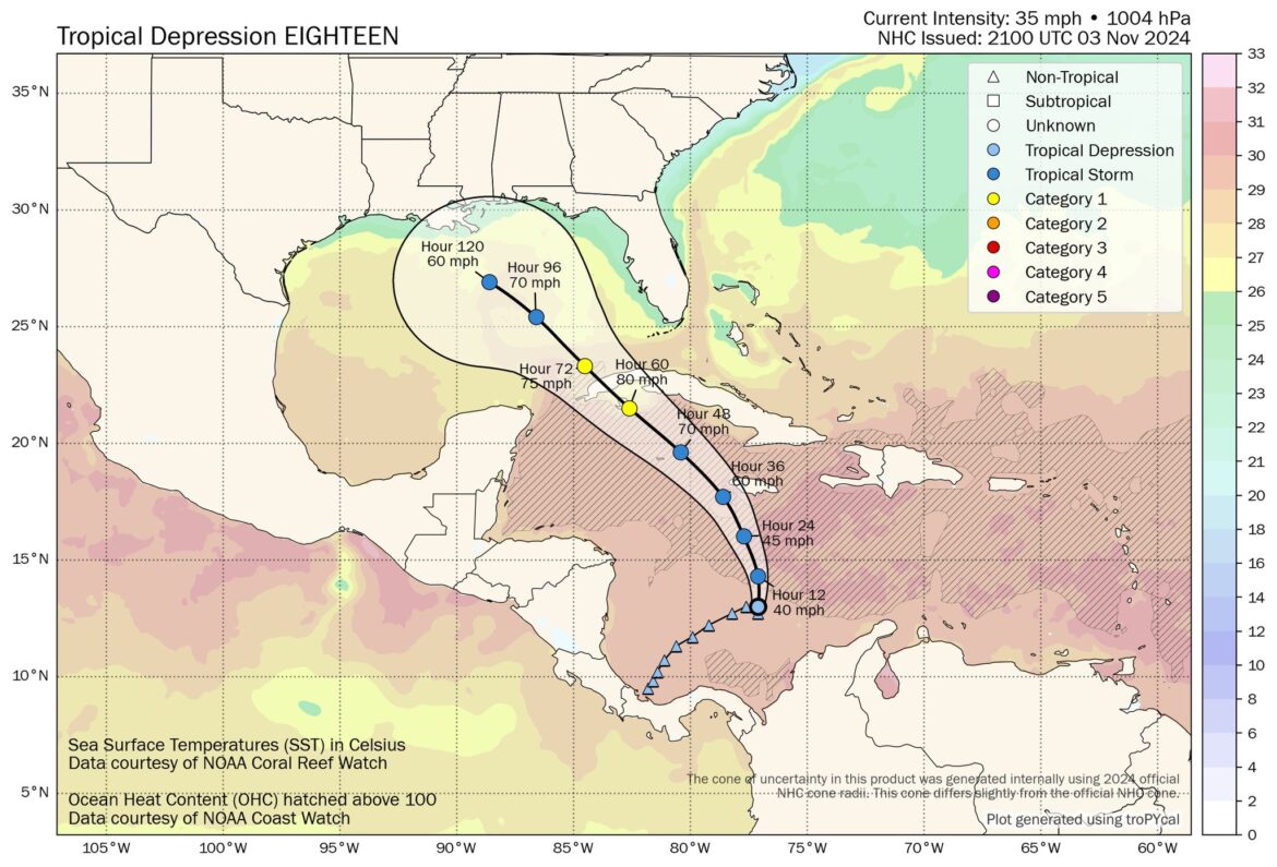 The environmental conditions appear conducive for strengthening during the next few days, and it seems likely that the system will become a tropical storm (the name will be Rafael) before it reaches Jamaica and a hurricane before it reaches Cuba. However, later in the week, southwesterly vertical wind shear and intrusions of dry air should end the strengthening process and likely induce weakening once the system reaches the Gulf of Mexico.