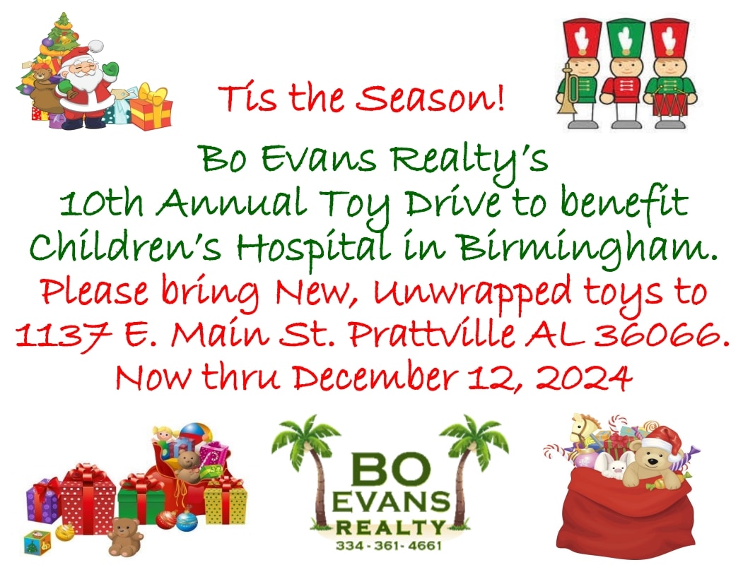 Bo Evans Realty, owned by Bo and Punkin Evans, has been in business in Prattville since 1992, and this is their 10th year hosting the toy drive. The toys go directly from Bo Evans Realty’s office straight to the Children’s Hospital of Alabama in Birmingham, which is classified as one of the best Children’s Hospitals in the country.