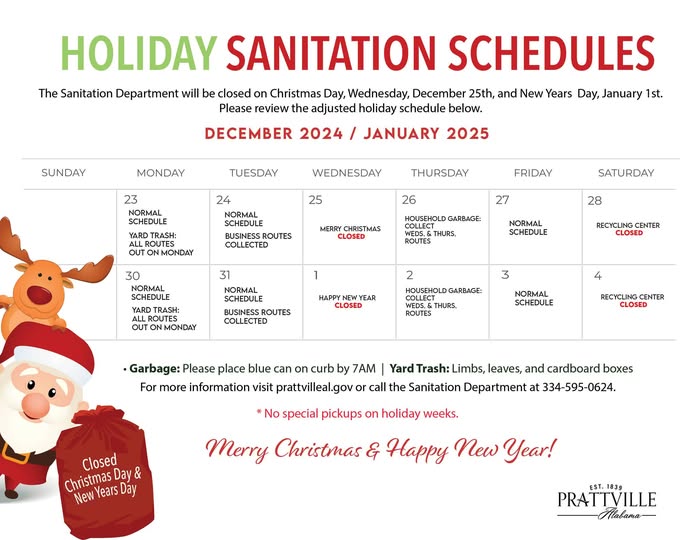 The Sanitation Department will be closed on Christmas Day, Wednesday, December 25th, and New Year’s Day, Wednesday, January 1st. Please review the adjusted sanitation schedule below. For more information please visit prattvilleal.gov or call the Sanitation Department at 334-595-0624.