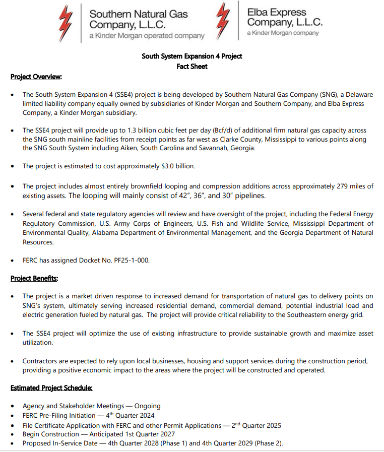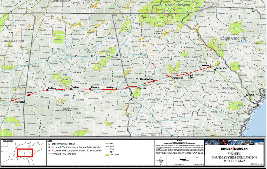 The South System Expansion 4 Project consists of 14 new natural gas pipeline loops totaling approximately 279 miles primarily along SNG’s existing South Main Line in Mississippi, Alabama, and Georgia; modifications and/or horsepower expansions to add compression at 13 existing stations; and four new meter stations and modifications to nine existing meter stations.