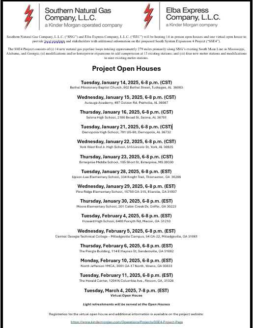 Kinder Morgan, one of the largest energy infrastructure companies in North America, will be hosting an in-person open house in Autauga this week to provide local residents and stakeholders with additional information on the proposed South System Expansion 4 Project. The open house for Autauga County is Wednesday, 1/15, 6-8 p.m. at Autauga Academy, 497 Golson Road, Prattville.