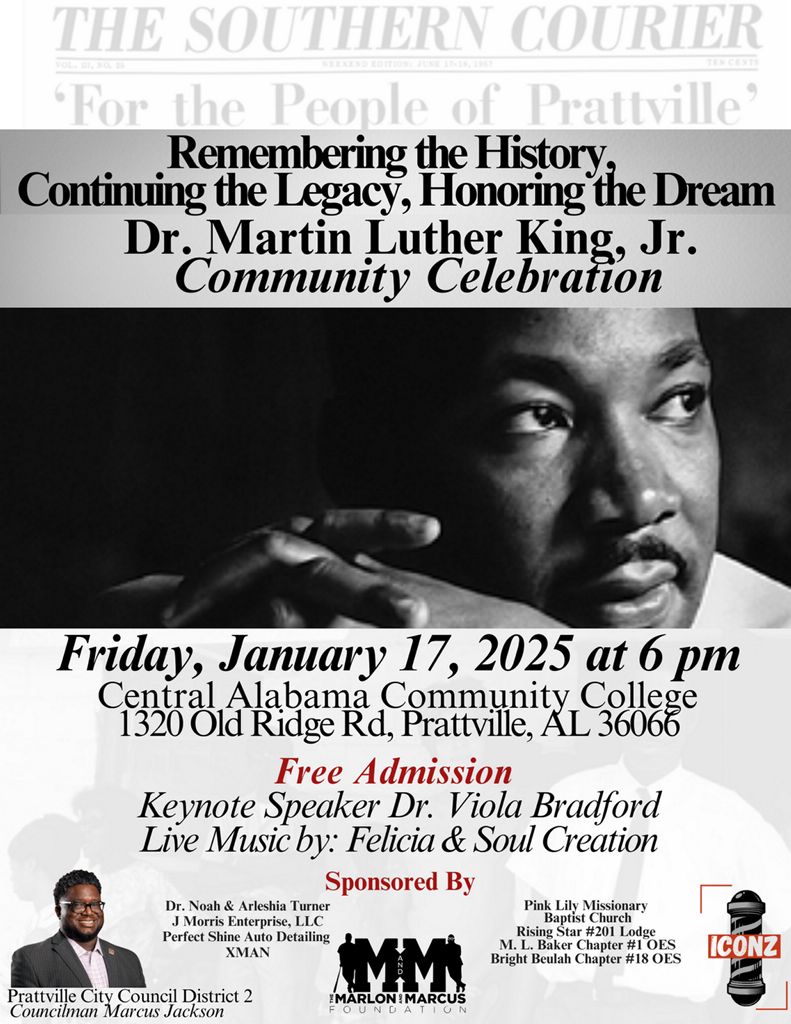 A celebration of the life and legacy of Dr. Martin Luther King, Jr will be held Friday, Jan. 17, 2025, at 6 p.m. at Central Alabama Community College.