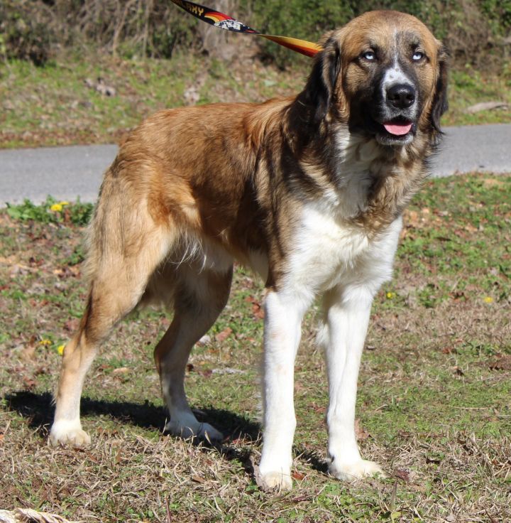 Bumble is a 2-year-old male Anatolian Shepherd/Husky mix; and we believe he may also have Great Pyrenees in his mix. He must be neutered before adoption. Bumble was found in a Prattville neighborhood; and no owner came to reclaim him. This is a truly gorgeous dog! Bumble’s long coat is mostly brown with a good bit of white markings; and he has black highlights around his face. He has stunning crystal blue eyes. Bumble weighs 51 pounds so he is considered to be a large adult dog. He is well behaved on a leash; and very sweet. Because he is a stray, we are still learning about him. If you would like more info about him–come out and meet him or call our staff.