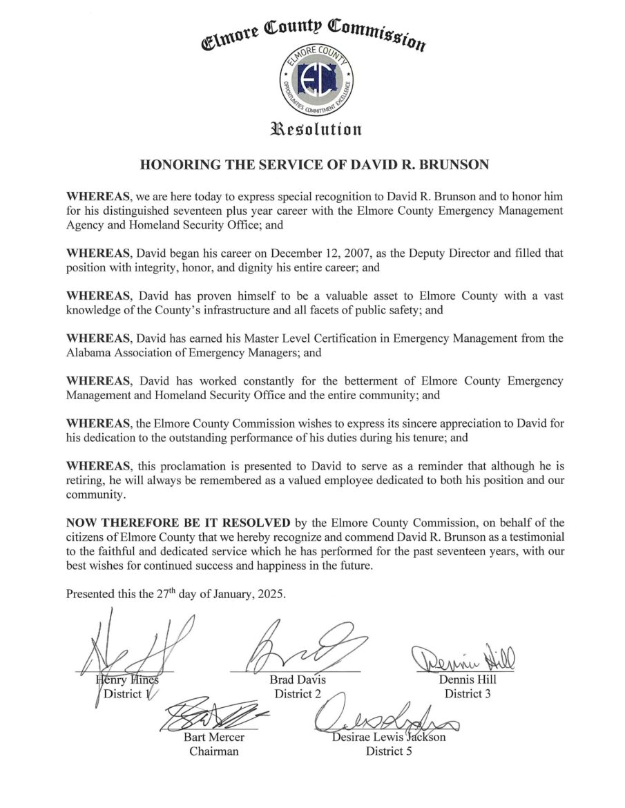 “He was able to obtain a master’s level certification in emergency management from the Alabama Association of Emergency Managers. David is the reason that Elmore has a CERT program, a Community Emergency Response Team. The reason it is as successful as it is, is because David had the vision years ago and the drive to get it stared. He kicked off the Amateur Radio In Emergency Services Program.”