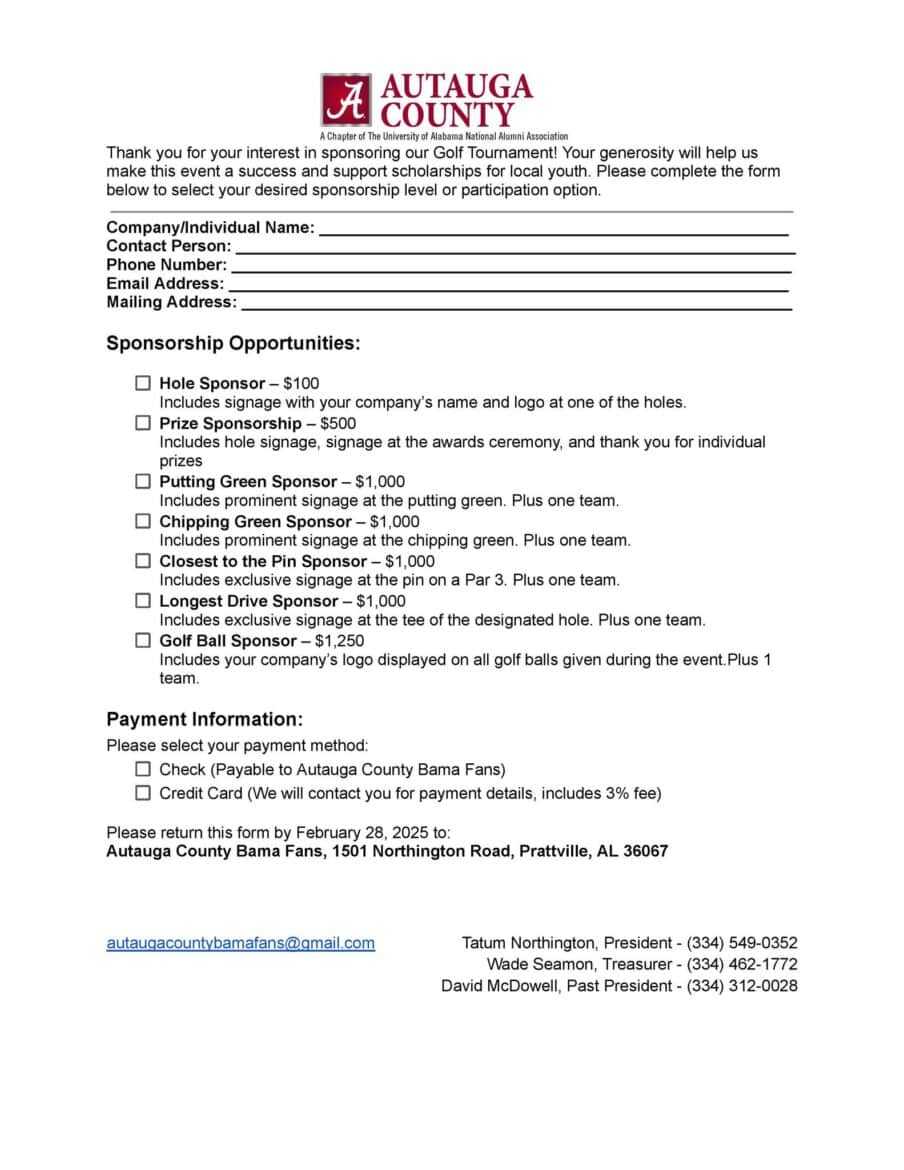 PRATTVILLE, AL – The Autauga County Bama Fans are excited to announce their Inaugural ACBF Scholarship Golf Tournament, set for Monday, March 24, 2025, at the Prattville Country Club. This event promises a day of fun, networking, and competition, all while raising funds to support scholarships for deserving students attending the University of Alabama.