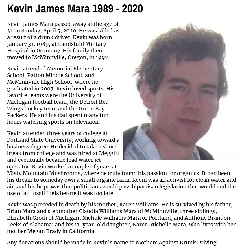In Kevin Mara’s obituary, his family asked for any donations to be made in Kevin’s name to be sent Mothers Against Drunk Driving. (See full obituary below.)