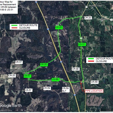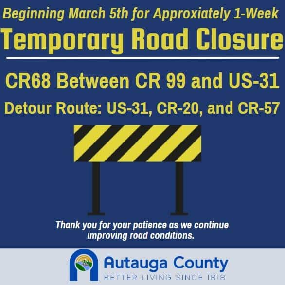 The Autauga County Engineer’s office has identified a cross-drain pipe on CR-68 between CR-99 and US-31 that is structurally deficient. This MUST BE done prior to an upcoming resurfacing project on this segment of CR-68 (from CR-57 to US-31). With weather permitting, the Autauga County Engineer’s office will close this section of road beginning March 5th and will remain closed for approximately one week while our department completes the necessary work. The dedicated detour for this project will be US-31, CR-20, and CR-57. Thank you in advance for your cooperation and patience during the time it takes to complete this necessary project.